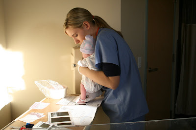 We had the best nurse ever...her name was Tara and she was so cute and sweet. She really made Ellie some cute "girlie girl" things and she was so great taking care of me also. In this picture she is getting Ellie's footprints....So sweet!